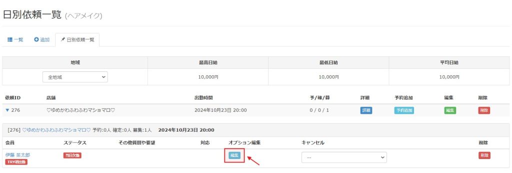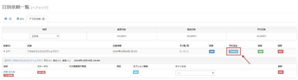 日別依頼一覧の該当店舗の予約追加をクリックして、出勤希望の会員さんをステータス【確定】で予約を入れる。